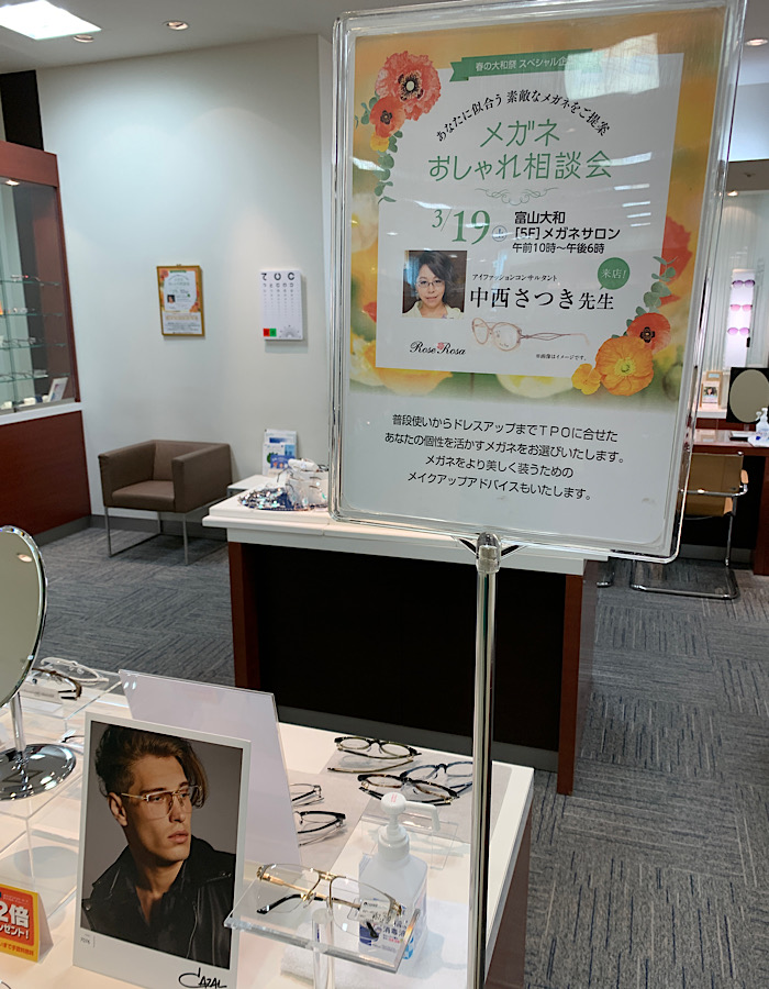3/19.20富山県、金沢市にある大和百貨店 様にて今年もメガネ相談会が開催されました。当協会、協賛にて代表 中西が担当にてお似合いになるメガネを選びメガネに合うメイクやカラーなど…