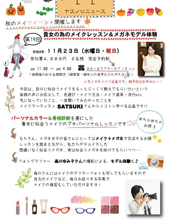 天王寺区ヤスノリ眼鏡様でイベントが開催され、代表中西が、メイク、カラー、骨格をふまえてメガネを楽しむ方法を個別アドバイスします。当協会も協賛しています。メガネを視力補正でありながらも…