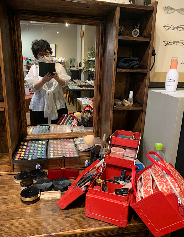 トータルビューティとして、メガネを楽しむために実際に見て・感じて・学ぶ場を提供しています。様々なメガネのフレームを実際にお試し頂いたり、新しいメイク道具に触れて頂いたり、実際にご自身で新しいメイクにもチャレンジできます。メガネという道具をここで見つめ直し、「新しい美」の発見や気付きの場になるとご好評頂いています。