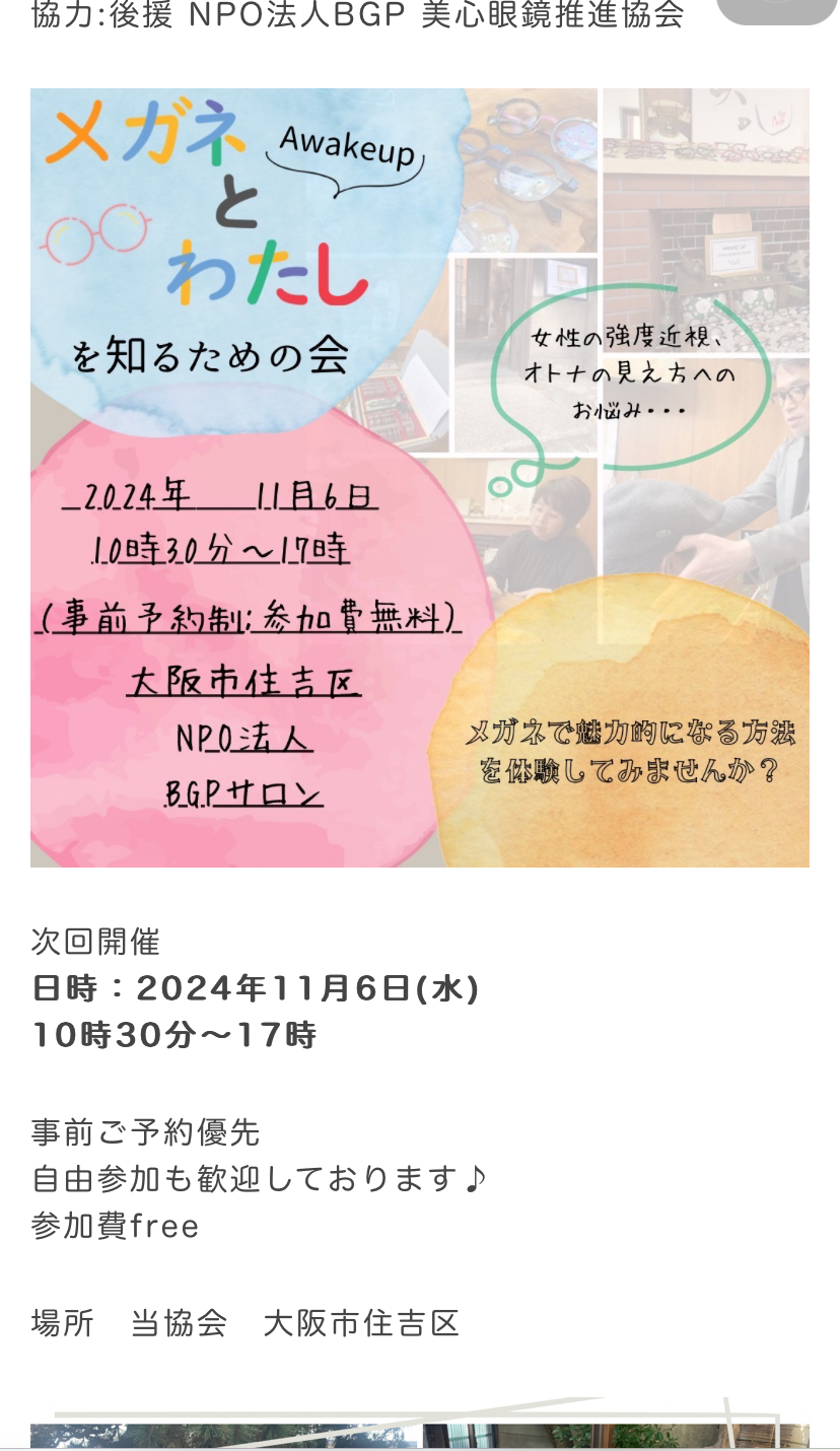 2ヶ月ぶりの開催となりました!メガネと私を知るための会大阪 中津駅前ブランズタワーにて無事開催こちらのイベントは眼鏡屋でもなく、眼科でもない場所で、メガネについて、ご自分らしい似合…